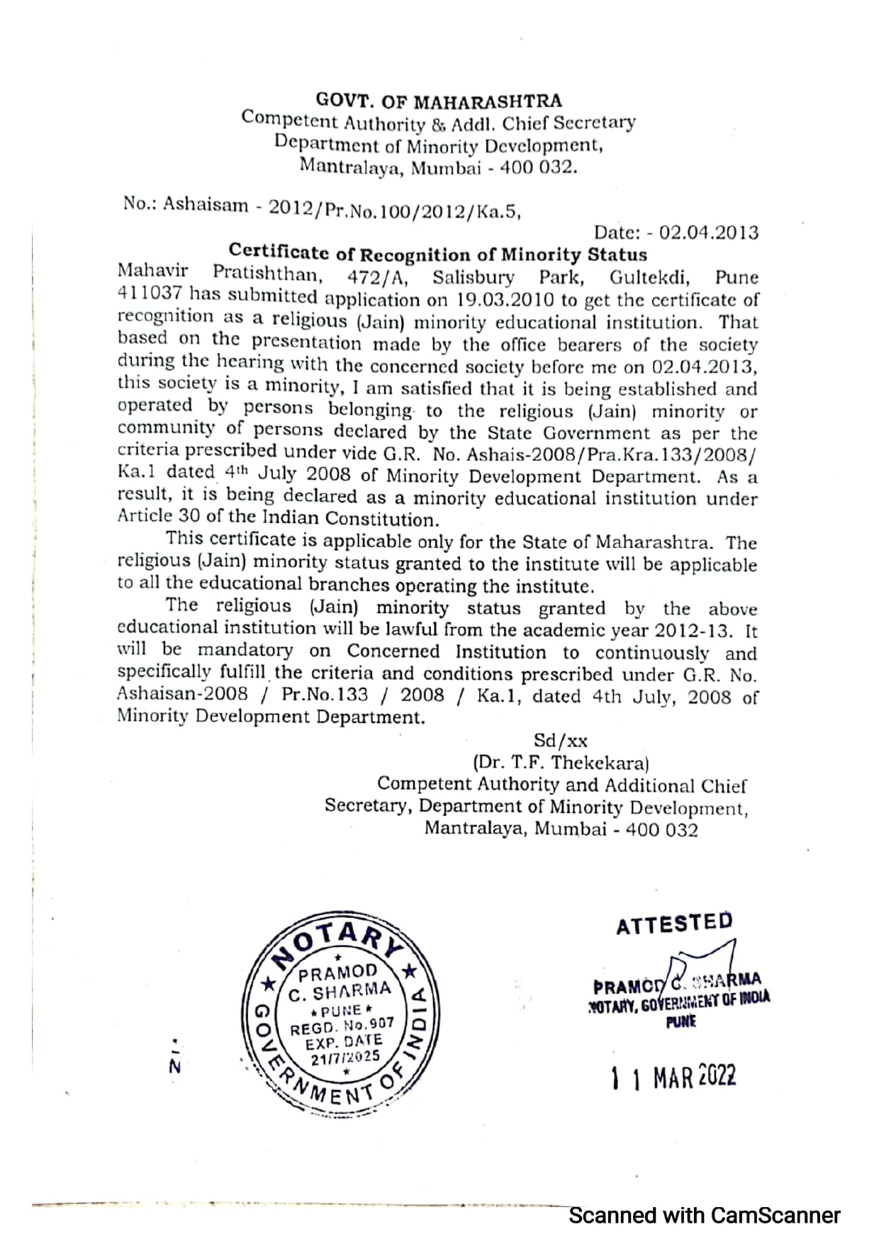 Recognition & Affiliation Certificate (In English and Marathi)
